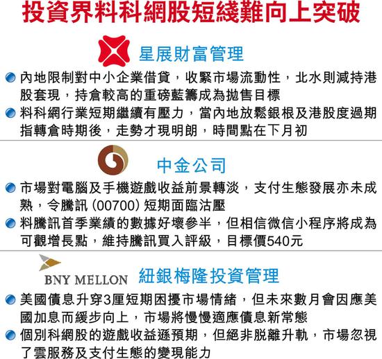 纽银梅隆投资管理称,近日中兴被美国制裁事件并不影响整体科技行业的强劲增长动力,近日弱势仅反映资金换马而非恐慌抛售。旗下新兴及亚洲股票投资组合经理Naomi Waistell更指,科技企业的季度游戏收益逊预期,并不代表长线升势出现转捩点,市场也稍为低估两大中资科网巨头的云服务及支付生态的变现能力,故维持中资科网板块为买入之选。